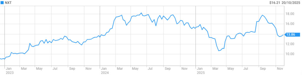 Technically, NXT trades in a medium term uptrend with consistent support across major moving averages. RSI remains in the low to mid fifties, suggesting the stock is in a steady trend rather than an overheated push. MACD remains positive, and volume patterns show institutional accumulation on pullbacks.