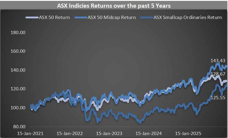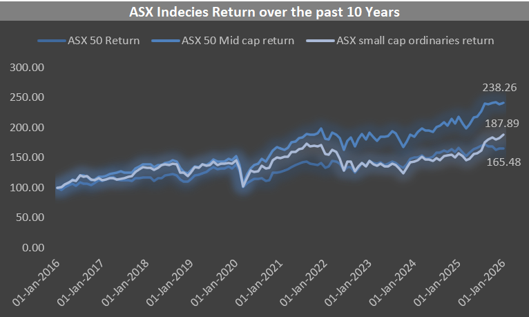 Above are the returns for 3 different index funds, ASX 50, ASX 50 midcap, and ASX smallcap ordinaries, across two different timelines. The five-year timeline was created to screen out effects of the covid-19 pandemic, and the numbers still seem promising. The large caps in the 5-year period have performed fairly well, with the mid-cap index being the clear winner. The ten-year returns provide a rather clearer picture of each of the 3 indexes, with the large-cap index providing a return of 88% and the mid-cap providing a return of an astounding 138%. This is owing to the rebalancing of the index. The small-cap ordinaries in the ten-year period provided the least return, of 65.5%, mostly attributed to non-survivorship bias.