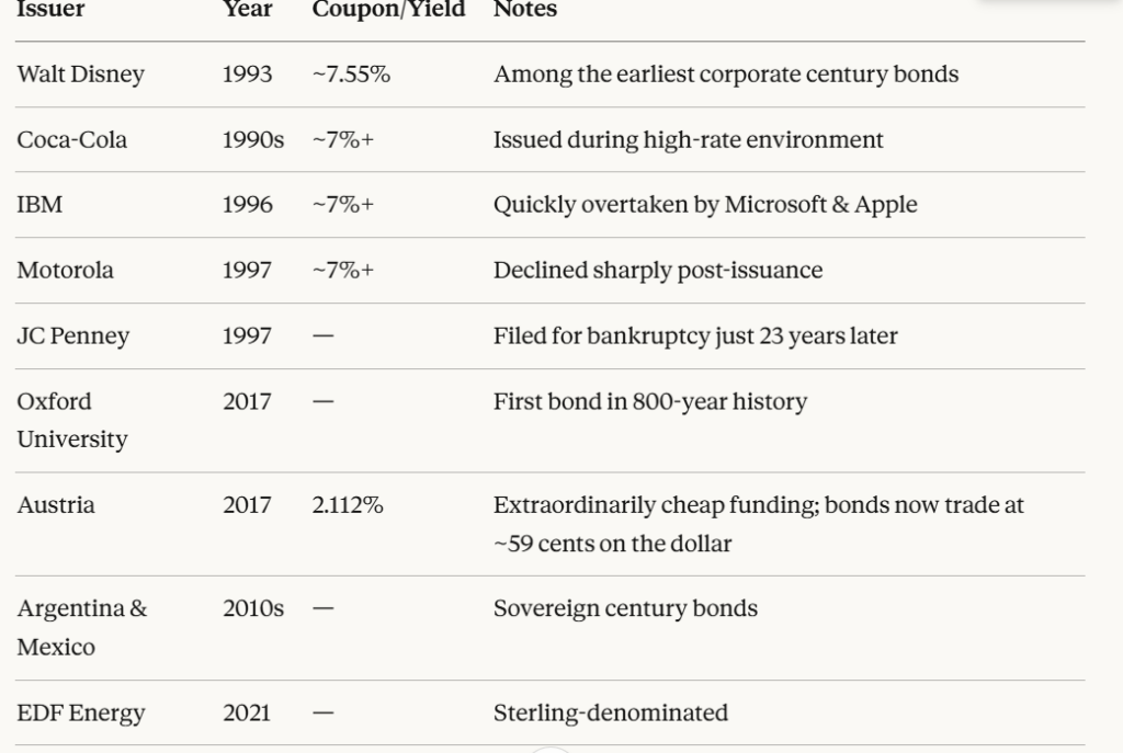 Companies rarely issue ultra‑long‑dated bonds because neither corporations nor their typical investors are truly permanent entities. A retail investor buying a hypothetical 100‑year Google bond today is definitely not going to be alive when it matures, let alone in a position to actively use the principal repayment. For institutions with genuinely long time horizons, such as endowments, foundations, or sovereigns that are expected to exist for many generations, century bonds are a more natural fit, aligning with their intergenerational investment and funding objectives. Corporate century bonds do appear from time to time, but they remain relatively rare, and history shows that some high‑profile issues have produced mixed outcomes for both issuers and bondholders.
