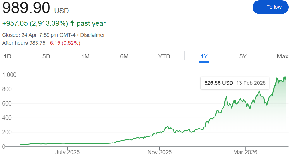 The narrative of scarcity quickly sparked a wave of speculation. Institutional capital flowed in, analysts pushed price targets toward $1,000 per share, and momentum-driven funds further intensified the rally. By April 2026, SanDisk’s stock was trading close to $990, representing an approximately 3,000% surge from its post spin-off listing price.
