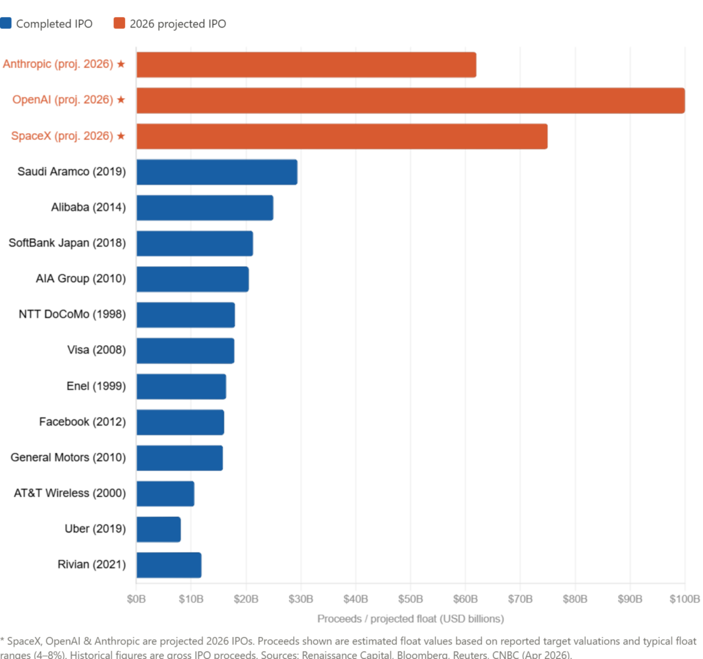The combined valuations of SpaceX, OpenAI, and Anthropic are without precedent. Estimates suggest SpaceX could target a valuation of $1.75 trillion, while OpenAI may seek around $1 trillion, and Anthropic has already reached roughly $380 billion. Even with relatively modest public float percentages, these offerings could collectively raise well over $100 billion. At more typical float levels, industry giants project the trio might need to raise between $432–$576 billion, an amount that would surpass the total capital raised by all U.S. IPOs between 2016 and 2025.